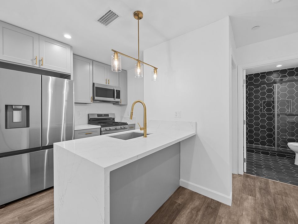 Open concept kitchen with quartz waterfall countertops, brushed gold faucet, and stainless steel appliances (fridge, gas stove, microwave)