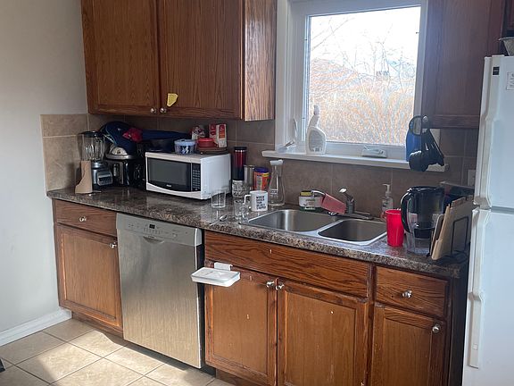 The eat-in kitchen offers warm-toned cabinetry, ample cupboard space, and plenty of room for a dining tableperfect for family meals or casual gatherings.