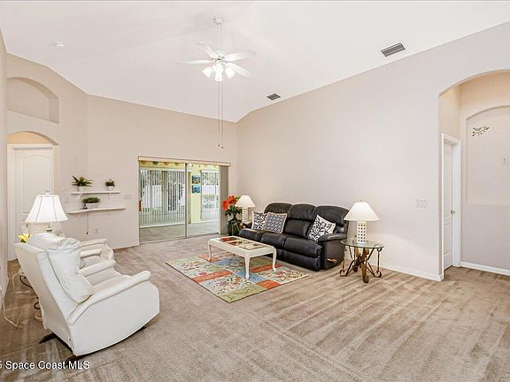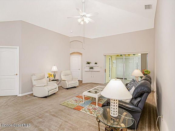 Welcome to Pine Creek a beautiful 55 plus gated community. This home boasts two bedrooms, two baths, split plan and a flex room that can be used it as an office, hobby room or gym. Eat in Kitchen with new appliances and a breakfast bar. Open plan living room and dining room with soaring ceilings. Florida room has been tastefully renovated and is under air and has electric shutters. All other windows have accordion shutters. All windows in home are adorned with plantation shutters, giving that Florida Coastal vibe. Primary Suite has dual vanity, step in shower, and an ample walk in closet. Laundry room has plenty of storage and washer and dryer conveys.