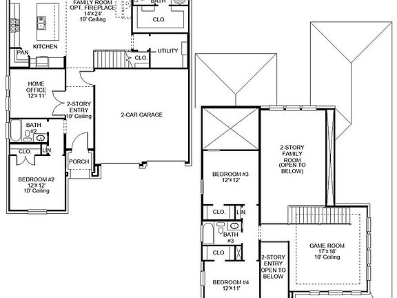 Home office with French doors set at two-story entry. Two-story family room with wall of windows opens to kitchen and dining area. Kitchen hosts inviting island with built-in seating space. First-floor primary suite includes dual vanities, garden tub, separate glass-enclosed shower and large walk-in closet in primary bath. A second bedroom is downstairs. Two secondary bedrooms and a game room are upstairs. Covered backyard patio. Two-car garage.