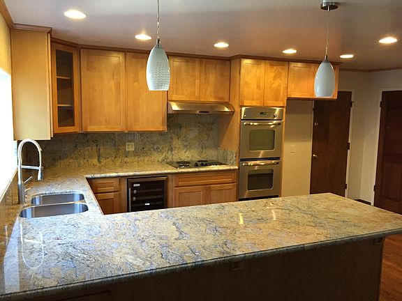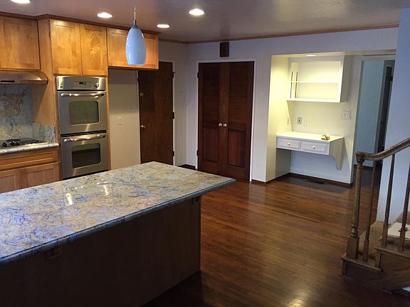 Large kitchen with maple cabinets, granite countertops. Breakfast bar, pantry, work desk area with hardwood flooring.