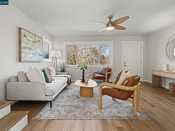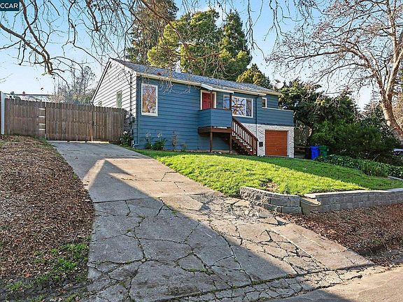 WOW! This recently renovated 3br, 2ba home on a large 7,000sf lot is a MUST SEE. Walk into the living room, with El Sobrante hills views and enjoy the corner fireplace. Up 3 stairs is your main bedroom, with ensuite and a deck overlooking the front yard with views of the El Sobrante hills. Or make it a home office (terrific if you see people at work), or a private guest suite. Back to the main level is a comfortable sitting area with large built-in that opens to the dining area and totally updated kitchen, with built-in appliances and stackable washer/dryer. Off the large main hallway are 2 large bedrooms and an adjacent updated bath. LVP flooring throughout, freshly painted inside and out, and a huge backyard. Great for play, pets, animals, or even build your own ADU. Plans are available for a 2br, 2ba ADU (included, depending on terms). One car garage, and 2 driveways make off street parking easy. Don't miss this one!
