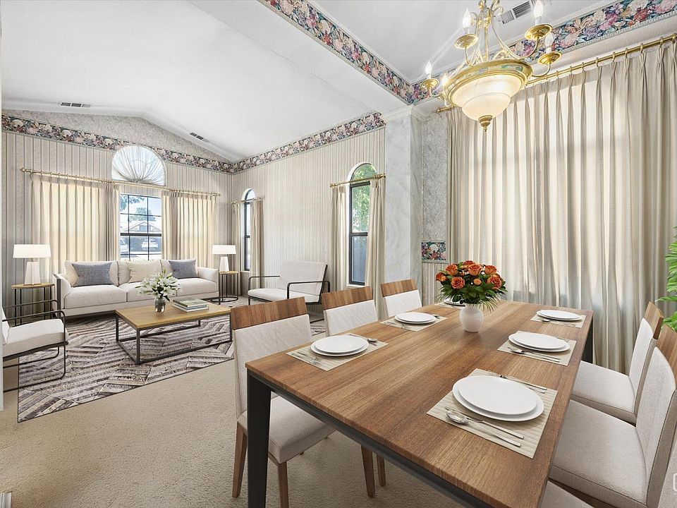 Located on a desirable cul-de-sac, this 3-bedroom, 2-bath, 1,604 sq. ft. home features a thoughtful layout that blends formal and casual living spaces, offering the flexibility to entertain guests in one area while enjoying everyday comfort in the other. The front living and dining areas showcase vaulted ceilings, large windows, and abundant natural light, creating an airy and open feel. The family room is anchored by a cozy brick fireplace and flows seamlessly into the kitchen, where a spacious breakfast bar and plenty of cabinetry provide ample room for meal prep and gatherings. Sliding glass doors open to the backyard, extending the living space outdoors. With its thoughtful layout and multiple areas to entertain or relax, this home offers a flexible design to fit your lifestyle.
