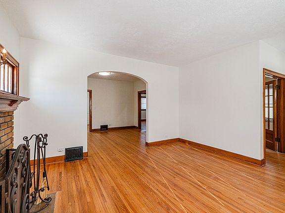 The front door opens into an entryway with a coat closet and french doors leading into a spacious living room, which features a beautiful decorative brick fireplace, accented by classic sconces on either side. Through an arched doorway is a dining room, with ample space for a full-sized dining table!