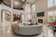 Sparkling poolOutdoor kitchenWalls of windowsFire-lit loungePrivate officeRich tile flooringLarge granite-topped island
