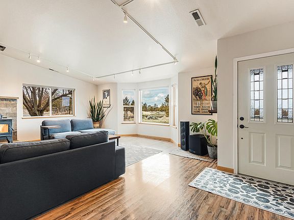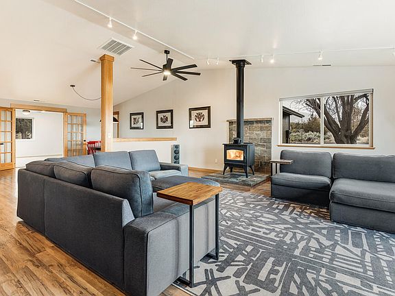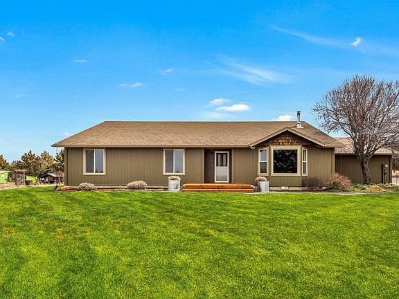 Perfect Hobby Farm! Peace and serenity surround you on this private 5-acre parcel with gorgeous Cascade Mountain and Smith Rock views in Powell Butte's Steelhammer Ranch neighborhood. Beautifully upgraded single level home with Great Room floor plan, complete with vaulted ceilings, cozy wood stove and luxury flooring. The kitchen has sunrise windows, large island, solid wood cabinetry and an enormous pantry (could be a flex space). In addition to the great room, there is a large sunroom that opens to a private covered patio on the back deck.