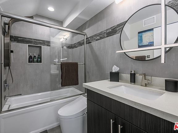 Welcome to your private Hollywood sanctuary, a rare 4-bedroom designer showpiece tucked inside the exclusive gates of Sol Hollywood. Just two blocks from West Hollywood and steps from the Sycamore District's trendiest spots, this home is more than turnkey, it's cinematic. Renovated top-to-bottom from 2021 to 2022 with no expense spared, it offers a seamless blend of elevated design, smart home innovation, and effortless indoor-outdoor living. Wake up to sunlight filtering through Lutron motorized shades, sip coffee in your metal mosaic-accented kitchen with custom cabinetry and premium appliances, then spend golden hour on your rooftop terrace beneath bistro lights, watching the Hollywood Sign catch the sunset glow. Entertain under the stars with your gas grill and fire pit, surrounded by lush planters and panoramic views of the Hills, the skyline, and even fireworks from the Bowl. Inside, every detail evokes boutique hotel luxury, from marble, mother-of-pearl, and mosaic finishes to spa-inspired baths with rainfall showers and genuine stainless steel fixtures. With 2,378 square feet of living space, nearly 900 square feet of outdoor entertaining areas, an upgraded two-car garage, whole-house water filtration, and full Apple HomeKit + Alexa integration, this home is as functional as it is fabulous. Tucked away from the street with no shared walls and direct access 2-car garage parking, it offers rare privacy and serenity in the heart of LA's most iconic neighborhood. This is not just a home; it's a statement, a retreat, a lifestyle.