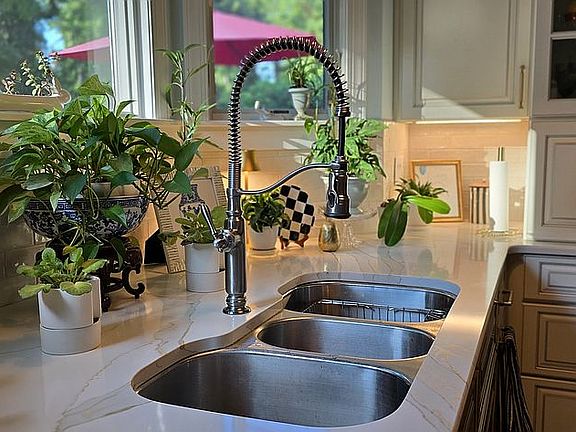 The beautiful kitchen hosts an expansive center island, prep sink,and both a beer and a wine cooler. Additionally, there are quartz countertops, custom solt close, solid wood cabinets, under cabinet lighting, tiled backsplash, pot filler and Monogram GE appliances, including convection ovens and dual Fisher Paykel dishwashers.