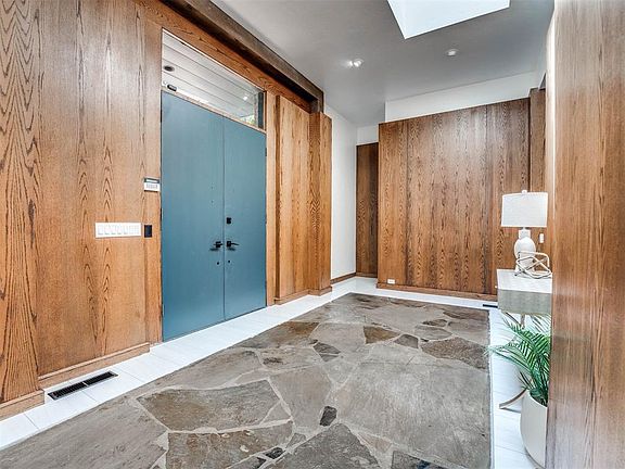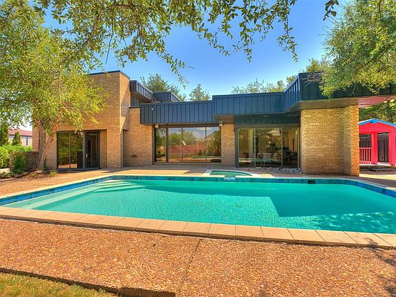 Jim Frazier Contemporary Quality Built Home! Nearly half an acre in the heart of Nichols Hills right off NW Grand and Nichols Rd just north from Grand Blvd Park. Inside the home you will find coveted original stained contemporary mid-century feel woodwork. Gigantic original wall wood panels, rounded walls, high loft ceilings, heavy wood staircase rails, flagstone floors that have been newly sealed, heavy wood massive original architectural wet bar, and a formal entry with double doors with flagstone ,new ivory porcelain border tile. Kitchen with granite, pantry, chef's stainless gas stove newer cabinets and back splash. This is a kitchen club area, curved walls, built-ins with quaint den and eating space facing the saltwater pool. The master does in fact have 2 totally privately divided bathrooms,listing reads 2 and a half baths, in reality it is 3 and a half as the master has 2 toilets and 2 separate bathing areas. The home is full of massive 6-8 ft picture windows facing the pool area , patio area and upstairs second loft level. The home screams privacy upfront , but family and openness in back. The concrete parking upfront could easily fit a party for 20 people. The oversized garage is connected to a huge concrete pad that could easily fit a huge boat. Please check with Nichols Hills rules and regulations first before doing so. This does however accurately describe the paved space available on this lot with whatever your needs might be! The inside has been through a move in ready makeover with new flooring in all beds, new toilets, new light fixtures, ceiling fans, fresh white paint inside from top to bottom including closets, pantry and the garage! Appliances and TV's included. Staging furniture reserved.