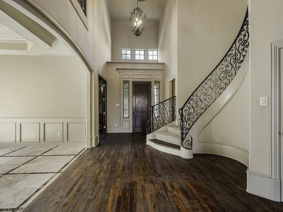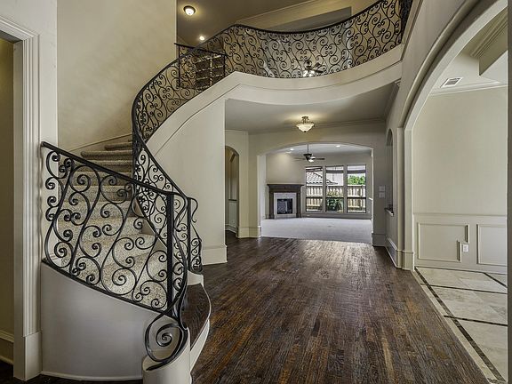 Discover unparalleled elegance in this beautiful custom home, where exquisite details and luxurious finishes abound. Step inside to an elegant entry featuring a sprawling iron staircase, setting the tone for the sophistication within. Adjacent to the entry, you'll find a grand dining room illuminated by a sparkling chandelier, perfectly complemented by a nearby wine room ideal for entertaining. A handsome study provides a refined space with custom built-in bookshelves and a spacious desk, perfect for work or quiet contemplation.
