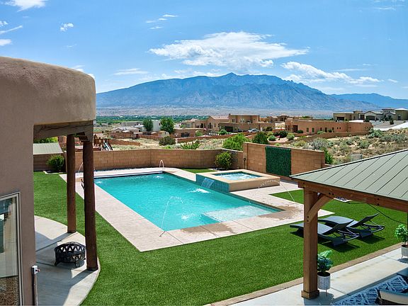 From the moment you step into this southwest contemporary style casa, you will know you have found home! From the lovely southwest touches including niches galore for art work and prized possessions, to the wooden beams and ceiling work that remind you of an elegant pueblo adobe. Panoramic views of the city lights at night and Sandia Mountains that stretch out in front of you. Whether lounging in the bedroom in front of a fireplace or from the kitchen and family room, those views are yours to enjoy. Wanting to cool off and have fun in the summer entertaining friends and family, enjoy the pool, hot tub, and basketball court in the spacious resort style backyard. So many more features that this house is a must see!