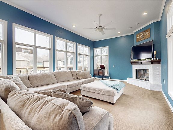 This exceptional home offers nearly 4,000 square feet of finished space, including a walk-out lower level and an expansive 1,134-square-foot garage, all situated on a beautifully landscaped .54-acre cul-de-sac lot with mature trees. Inside, you'll find a grand foyer with a curved staircase, a home office, and an 11-foot ceiling living room with a wall of windows and a wood-burning fireplace. The white kitchen features granite countertops, stainless steel appliances, and a pantry, while the main floor also includes formal dining, a 3-season room, and a mudroom. Upstairs are three bedrooms, including a primary suite with a luxurious bath, plus a large laundry room. The lower level offers an open-concept family room, a bar, game space, billiards room, and a guest bedroom with private entry. Outside, enjoy a large front porch, back deck, and a wooded backyard trail, along with numerous upgrades like irrigation, central vac, a firepit, and an invisible pet fence.