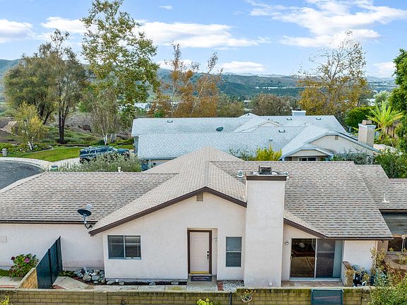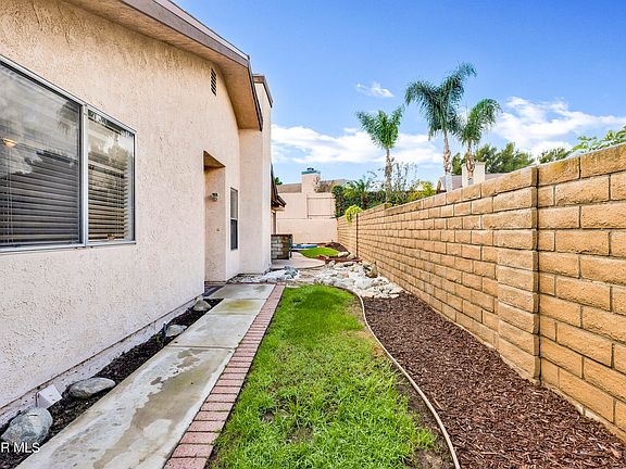Set on a hilltop cul-de-sac, this single-story Varsity Park Patio Home welcomes you with a lush front lawn, stone-accented garage, and a brick-lined walkway leading to a gated courtyard entry. Inside, wood-like laminate flooring flows seamlessly throughout, creating a unified backdrop for the home's light and open layout. The living room features vaulted ceilings, solar tubes, and a tile-accented fireplace, with a slider offering views of the courtyard. Just off the living room, the dining area includes a pass-through to the kitchen, making everyday meals and entertaining convenient. The galley-style kitchen includes dark cabinetry, Formica countertops, an etched-glass window, black appliances, and a breakfast nook with a slider that opens to the backyard. In the primary suite, two closets, including a walk-in with built-in cabinetry—provide ample storage. A slider opens to a patio area, extending the space for quiet mornings or relaxed evenings. The en-suite bathroom features a dual-sink vanity and an oversized walk-in shower. The hall bathroom includes an updated vanity, modern lighting, and a reglazed tub/shower combination. Both bathrooms offer newer dual shower heads with handheld options. Two secondary bedrooms include ceiling fans and closet storage, with one offering access to the patio area. A linen cabinet and hall closet add additional storage in the hallway. An indoor laundry area with storage cabinetry and a newer LG washer and dryer adds daily convenience. Other improvements include paid solar, a newer water heater, furnace, AC compressor, and a newer garage door opener. The backyard features a lawn area and an in-ground spa, creating a flexible outdoor space to enjoy. Offering single-story comfort, useful updates, and convenient access to nearby amenities, this home stands out as a great Moorpark opportunity.