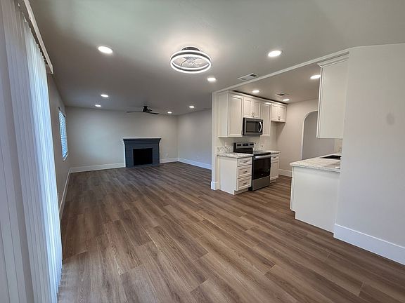 Step into this beautifully remodeled 1950s home that perfectly blends classic charm with modern comfort. From the newly poured driveway to the expansive front yard, every detail has been thoughtfully refreshed. Relax on the welcoming front porch and enjoy the peaceful neighborhood setting. Inside, the brand-new kitchen is a chef's delight, featuring sleek stainless-steel appliances, a deep sink, and a fresh, contemporary design. The open living and dining area is warm and inviting, showcasing recessed lighting, dual ceiling fans, and a cozy fireplace, with sliding door access to the spacious backyard. Each bedroom offers a generously sized closet and adjustable ceiling fan with lighting, while both bathrooms feature stunning tile stall showers. The large backyard is perfect for entertainingstring up some bistro lights and enjoy evenings under the stars or lazy afternoons beneath the mature shade trees. The garage will be finished with stylish epoxy flooring. Tenant responsible for all utilities. No co-signers.