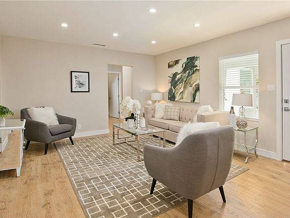 Elegant home remodeled with luxurious upgrades throughout! This four bedroom three bathroom offers an open kitchen with white shaker cabinets with soft closing hinges, quartz countertops, with Carrera marble backsplash, new stainless steel appliances, and utility style stainless steel sink. Spacious dining area with shimmering chandelier. Master suite offers 2 closets, its own bath with contemporary dual vanity, walk in shower with bench, beautiful wood-like tile floors and gorgeous light fixtures. Three bedrooms with 2 common full bathrooms with tiled showers, bath tub and modern vanity and light fixtures. Side by side laundry with overhead cabinets and quartz folding ledge. Large private backyard perfect for entertaining complete with Trex patio, mature trees and expansive grassy area. The owner spared no expense with upgrading this home with LED lighting, paint inside and out, cabinets, counter tops, new appliances, bathrooms, interior and exterior doors, fully landscaped front and back yards, tiled porch and walkway, sprinklers, newer roof and electrical panel,and so much more. This home is truly move-in ready, move in and relax! The job has already been done for you.