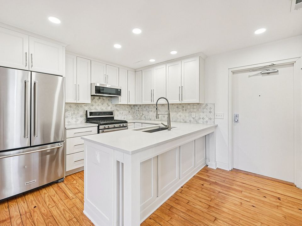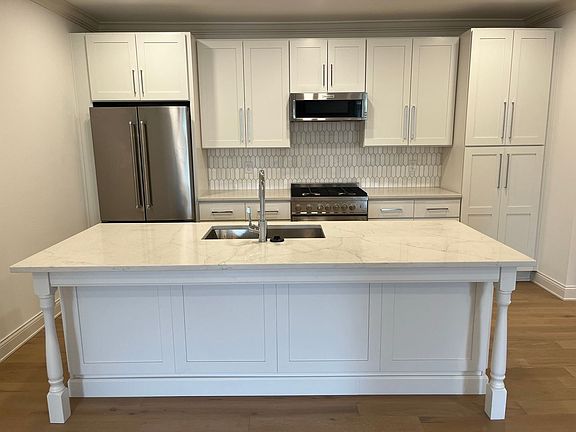 Custom built quiet-close cabinetryStainless steel appliancesDouble bowl sinkExposed brick accent wallsMarble backsplashesWalk-in closetQuartz countertops