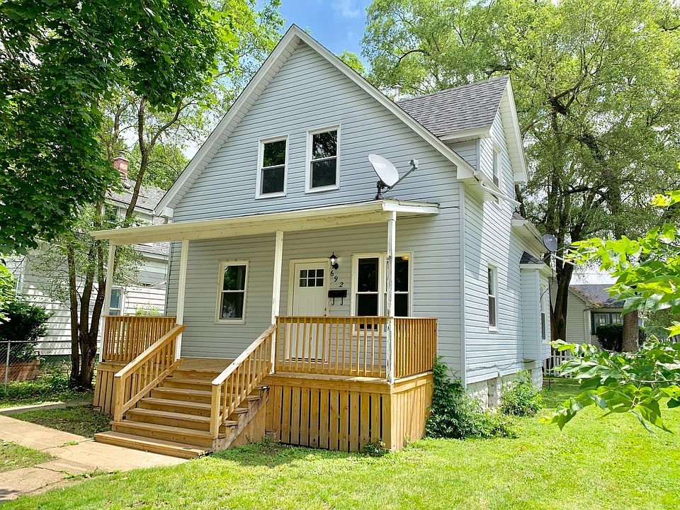 Beautifully remodeled home on a corner lot. The following upgrades in 2019: New replacement windows, doors, trim, both baths, kitchen, new front porch, new lighting, carpeting, all freshly painted, and new water heater. This home is ready for you. The front covered porch greets you to open up living room and dining room. The dining room has a corner shelf unit for displaying your precious items. Convenient first floor bedroom that may be an ideal office, nursery or toy room. Spacious bedrooms on the second floor with three huge walk-in closets. Super clean. Call today for your private tour.
