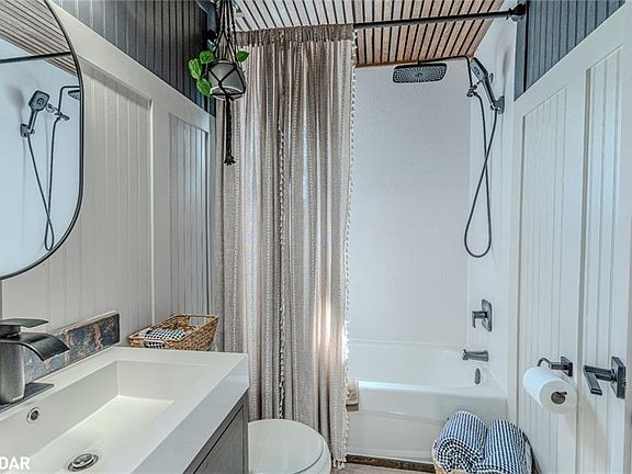 CHARACTER-FILLED LEGAL DUPLEX WITH TWO ABOVE-GRADE UNITS, ENDLESS UPDATES, BUNKIE, & WALKING DISTANCE TO THE WATER! This legal duplex is full of character and possibility, featuring a bright 2-bedroom, 1-bath main home and an above-grade 1-bedroom, 1-bath apartment that offers potential rental income or multi-generational living. Positioned across from Bayview Park with a playground and basketball court, and within walking distance to the harbour, waterfront, trails, schools, and shopping, the setting pairs lifestyle with convenience. The exterior stands out with vinyl siding, an updated roof, newer eavestroughs with gutters, an extended driveway with parking for three, and a welcoming front deck. The private, fully fenced backyard is designed for enjoyment with mature trees, a stone patio, updated steps, and a handy outdoor faucet. A beautifully finished bunkie with heating and cooling offers a versatile bonus space, perfect for a home office, creative studio, or guest retreat, featuring tasteful decor, vaulted ceilings and wood slat accents. The main home showcases a refreshed kitchen with white shaker cabinetry, a tiled backsplash, extended counter space, and some stainless steel appliances, including an updated dishwasher, while the second unit also enjoys a recently updated kitchen with shaker cabinetry, modern hardware, and a brick-style backsplash. Stylish, newer flooring, upgraded stairs, and updated windows elevate the living space, while the renovated bathroom showcases enhanced fixtures, a modern vanity, beadboard details, a wood slat wall and ceiling, and contemporary lighting. Comfort is further enhanced with improved attic insulation and venting. Well-maintained, clean, and move-in ready, this #HomeToStay brings together functionality, charm, and extensive upgrades both inside and out!