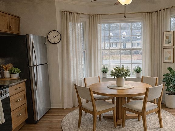 This thoughtfully designed floor plan welcomes you with abundant natural light on the main level. The kitchen offers ample counter space and a convenient pass-through window to the dining area. The dining space is ideal for everyday meals or small gatherings. The living room provides a comfortable area to relax around a warm fireplace and includes a door that opens to the private back patio. Enjoy outdoor time on the patio perfect for morning coffee, reading, or unwinding in the evening.