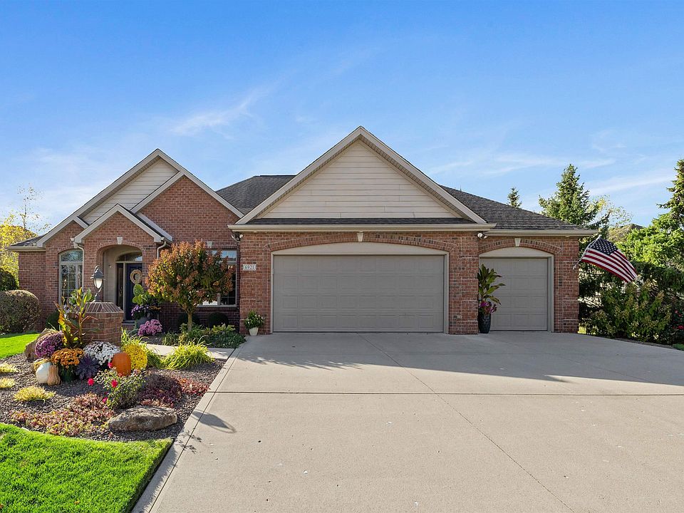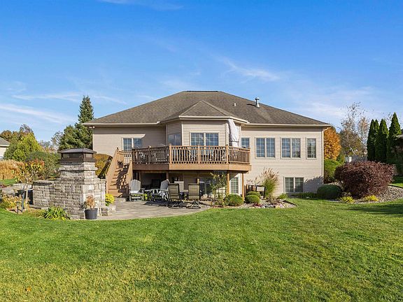 Beautiful 4-bedroom, 3.5-bath home w/ a 3-car garage, and scenic pond views. Property features an open-concept kitchen w/ white cabinetry, island, breakfast nook, double ovens, electric cooktop, and a double-sided gas fireplace shared with the sunroom, which includes surround sound and views of the pond. The formal dining room and crown molding throughout add an elegant touch. The primary suite offers a tray ceiling, custom walk-in closet, and pond view, while the primary bath includes heated floor and ceiling, Jacuzzi tub, double sinks, and a separate toilet area. Bedroom 2 features an attached bath w/ heated ceiling. The daylight finished basement includes a wet bar, built-in TV, surround sound, electric fireplace, workout room (5th bedroom), office, and spacious storage room with stair access to the garage. Outdoor living includes a custom gas and wood burning fireplace overlooking the pond with sunset views. Includes a wide staircase, SimpliSafe security, April Aire humidifier, reverse osmosis, gas garage heat, epoxy garage floors, and stain master carpet.