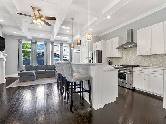 Welcome to this stunning 6-bedroom, 3.1-bath home, built in 2018 and situated on a desirable corner lot in Galewood. Enter through the side entrance on Newland Avenue into a grand foyer that opens to a bright and spacious main level with hardwood floors, high ceilings, and custom windows. The open-concept layout features a chef's kitchen with an oversized island, stainless steel appliances, quartz countertops, and a walk-in pantry, flowing into the family room with a wood-burning fireplace and elegant coffered ceilings. Step out to the backyard patio, complete with an outdoor fireplace, cooking area, and fully fenced-in yard-ideal for entertaining, relaxing, or pets. A formal living and dining room with balcony access adds elegance to the main floor. Upstairs offers four large bedrooms, including a luxurious primary suite with en suite bath and private balcony. A guest bath and a full laundry room are also conveniently located on this level. The finished basement includes high ceilings, a large recreation room, two additional bedrooms, and a full bath. Additional features include zoned heating and cooling, a 2-car garage, and close proximity to Metra, parks, schools, and dining. Don't miss this rare opportunity in sought-after Galewood!