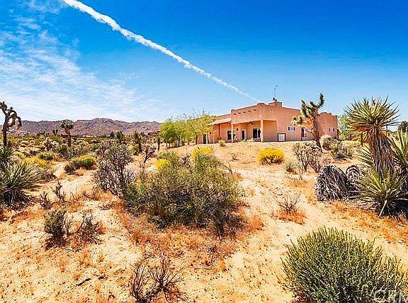 SUPERB ACREAGE/VIEW PROPERTY, SOUTH JOSHUA TREE in a prime location. Comfort and style intersect in this striking Southwest style home with sweeping desert views. Infinity pool and cedar spa. This spacious (almost 2200 sq foot!), 4 bedroom, 21/2 bath, well-appointed gem with abundant natural light throughout features 10-foot ceilings, Quartz countertops, a charming kiva-style fireplace, stainless steel appliances, an inviting split floor plan with a spacious entertainer's kitchen, enchanting courtyard with wrought-iron gate, attractive indoor/outdoor spaces, a finished 2-car garage and tasteful desert landscaping. The luxury master bathroom boasts a Roman tub and shower, his and her sinks and master bedroom an ample walk-in closet with natural daylight tube. This stunning abode also comes with all the modern amenities for comfortable living, like a Nest climate control system, central HVAC AND evap cooling, and even a below-sink reverse osmosis water system. To top it off, it's equipped with solar panels (owned, not LEASED!) to reduce electricity expenses. And this fabulous dwelling lies on a DOUBLE LOT--a full 2.5 acres! Not to mention--cable TV and high-speed internet available, minutes from the art galleries of downtown Joshua Tree, shopping and schools, and a quick drive to the Joshua Tree National Park entrance. This pristine, well-cared for beauty is the whole package!