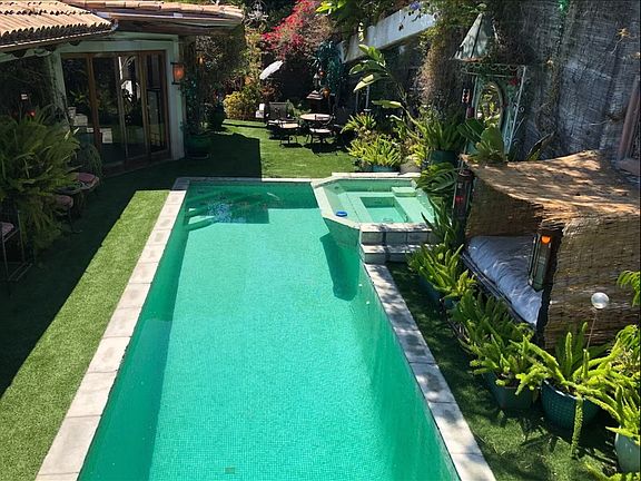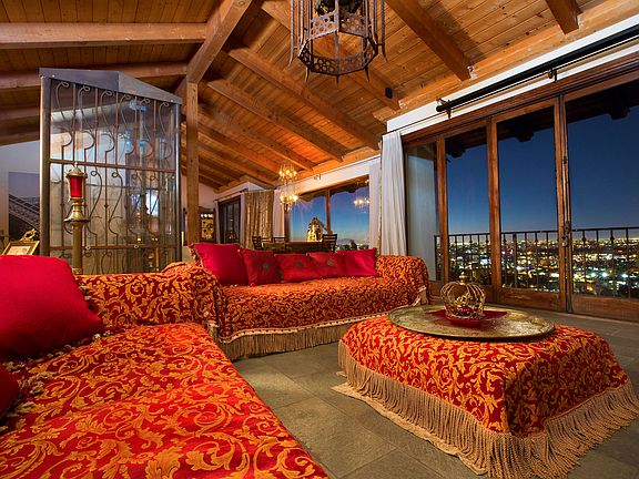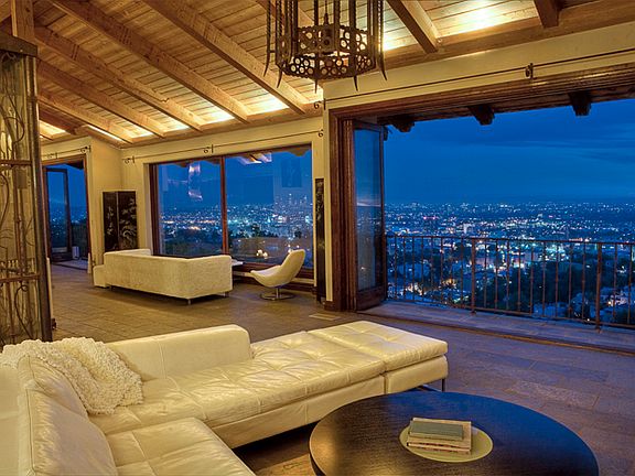 This home, like the Picasso and Chagall on its interior walls, is an 'Original, And One Of A Kind'. As you walk through the copper hammered front door and enter the anteroom, you are transported to the upper levels in an open framed cast iron elevator, which climbs through 4 stories of wrap around circular stone staircases, during the ascent your senses are brought to full attention to bear witness to every exquisite detail as each floor is revealed. Floor to ceiling glass walls accentuate the grand scale of the master suite giving way to jetliner views stretching from downtown LA to the ocean from the master bed. Draped with tapestries, fabric and hand made rugs, there has never been a more seamless mix of luxury & comfort. Adjoining the master bedroom is the master bath, encased in exquisite jade colored marble with a double headed steam shower plus a jacuzzi tub with views overlooking the city. 3 other en suite bedrooms boast custom fixtures and layouts designed so everyone lives like a king. Antique folding wooden doors encase floor to ceiling windows on the 4th floor, which open up to a stunning all tile pool & spa, as well as an endless view from the city to the water. 18' cathedral ceilings soar overhead, and the distressed copper kitchen cabinets accompany an antique stove, and crystal and cast iron chandeliers. With this turnkey property, hailed as 'the best house in LA', you are renting out not just a home but a lifestyle.
