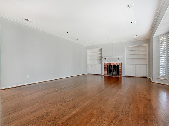 Modern fixturesBrick fireplaceRecessed lightingSpacious sunroomBuilt-in bookcaseHunter douglas shadesNew granite countertops