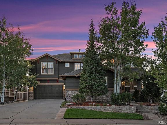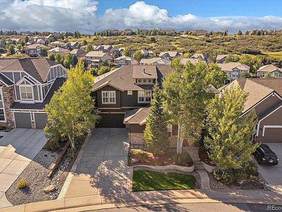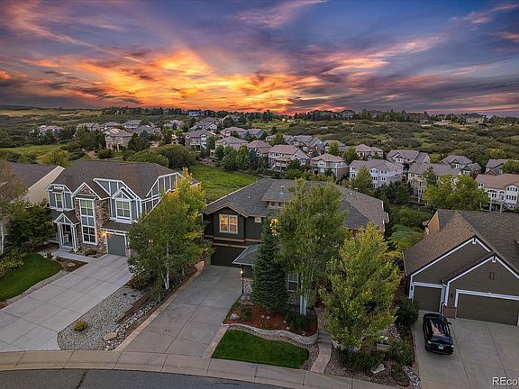 Welcome Home! Impeccably maintained and situated on a coveted lot backing to expansive open space and scenic trails, this property offers a truly stunning setting. Enjoy breathtaking sunsets from the elevated deck, complete with built-in heaters, a charming wood plank ceiling, and electric shades — all while watching buffalo and elk roam the landscape. Below, a cozy fire pit on the flagstone patio sets the stage for intimate evenings. Inside, the home is just as captivating. The main level features a dramatic two-story living room, formal dining room, and an inviting family room with fireplace that opens to a stunning designer kitchen. Highlights include Dolomite slab countertops, a large island, butlers pantry with custom door, 6-burner gas range with custom hood, designer tile, and a reclaimed wood beam for rustic charm. Rich hardwood floors and plantation shutters run throughout. Additional main floor features include home office and a 3/4 bath. The breakfast nook, framed by French doors, opens to the covered, heated deck - perfect for year-round entertaining. Upstairs, the luxurious primary suite is a true retreat, offering hardwood floors, a cozy fireplace, spa-like 5-piece bath with a free-standing soaking tub, and spacious walk-in closet. Three additional bedrooms are also located on this level: Bedroom #2 features a private en-suite ¾ bath, while Bedrooms #3 and #4 share a Jack & Jill bath. A versatile loft bonus room provides extra space for work or play. The finished basement is an entertainer’s dream, complete with a full bar, large family room with gas fireplace, pool table (included), gym, and a ¾ bath with steam shower. The fifth bedroom offers flexibility as a guest suite, second office, or playroom. In-ground trampoline also included! Unbeatable location—just a short stroll to Coyote Ridge Park, Daniels Park, and miles of trails. Only 15 minutes to DTC and 30 minutes to downtown Denver. A+ schools are the cherry on top. This home truly has it all.