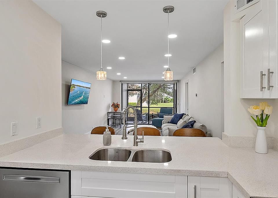 Discover exceptional value in this beautifully remodeled first-floor waterfront condo at Eastpointe/Briarwood. Enjoy wide-water views and effortless one-level living in a home featuring luxury manufactured wood flooring, quartz countertops, and premium stainless steel appliances, modern furnishings, all kitchen household items, linens, etc.. Freshly painted with a neutral designer palette, it’s truly turnkey. The spacious primary suite includes a walk-in closet, and the enclosed Florida room offers tranquil lake views for relaxing or entertaining. Complete with accordion hurricane protection, this home combines style, comfort, and unbeatable pricing—a rare opportunity not to be missed!