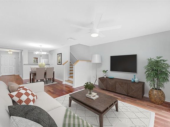 View of the pondGuest bathroomTree lined communityWood floorsUpstairs laundry room