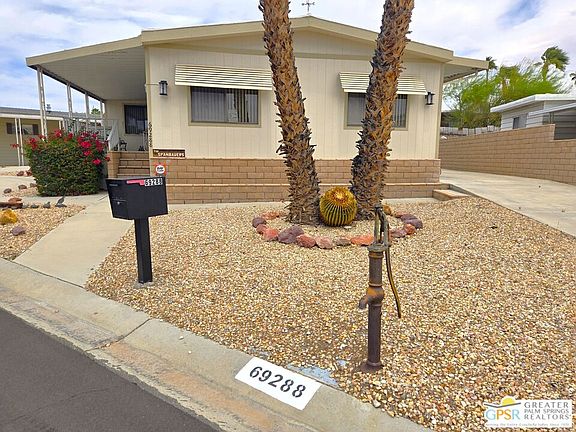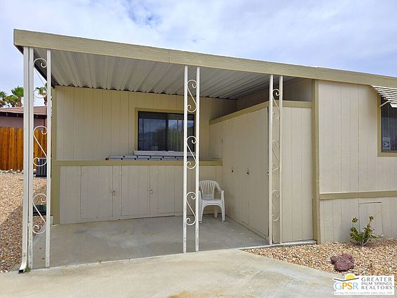 Nestled within the very lively and Active 55+ golf community of Desert Crest Country Club that is set in a beautiful rural setting, this one of a kind Three Bedroom and Two Bath, expansive 1690 Square Foot Manufactured Home built in 1978 offers a unique blend of comfort and convenience tailored for those seeking an active and vibrant 55+ lifestyle. Installed on one of the few oversized Lots in the community, the circular driveway and extra parking means you can have up to an RV here. Located in the heart of Desert Crest Country Club you are not far away from the huge Clubhouse, mineral spring water pool & several spas, and Par-3 golf facilities that are free to Owners, this home enjoys the perks of a quality lifestyle, surrounded by the scenic beauty of the desert landscape in the Western Coachella Valley. The Desert Crest Country Club community boasts a 9-hole PAr-3 golf course, inviting residents to enjoy leisurely rounds amid the picturesque setting of pond and mature trees that boast views of Mounts San Jacinto and San Gorgonio and the iconic windmills of the Banning Pass. This oasis extends beyond the golf course, offering a multitude of amenities enhancing your daily life. Residents here enjoy a multi-faceted Clubhouse featuring a healthy mineral water Pool and Spas, providing a serene escape and a hub for plenty of social connections. Indoor Shuffleboard and other activities are a welcome diversion here at the Clubhouse, with many interior facilities to keep you moving. The onsite cafe caters to culinary cravings for breakfast or lunch, the dog groomers attend to furry companions, and the real estate office ensures all needs are met with ease. These conveniences foster not just a residence but a sense of belonging within a home and community bound by shared experiences and vibrant camaraderie. At the center of it all you step inside this well-maintained home into a semi-formal Entry, and you'll discover its thoughtfully designed interior that includes a Living Room and Dining Area, Retro Circular Kitchen, and a separate Family Room. Three Bedrooms and two full Baths offer both comfort and functionality, catering to the needs of daily living within a spacious interior. The Master Bedroom stands as a serene haven, complete with a naturally lighted window that shows off the mirrored Closet Doors. Of special note is the Mid-Century Modern Kitchen that has a circled countertop space, Pantry, double Oven and oversized gas Cooktop. A Laundry Room inside the home completes what you need. All appliances are included too. You have a large Shed tucked away to the rear of the property in the Carport, an Outdoor Storage Space on the front side and ample parking with possible RV PARKING on the other side. The covered patio makes an inviting space designed for relaxation and entertainment. This is the ideal spot to revel in the beauty of the desert evenings, fostering moments of tranquility and social gatherings. The low maintenance xeriscape landscaping ensures that upkeep remains effortless, allowing you to focus on the joys of community living. This home represents a harmonious blend of comfort, style, and functionality, creating a delightfully private haven within the heart of Desert Crest Country Club. Whether indulging in a round of golf, luxuriating in the mineral water pool, or simply savoring the serenity of the surroundings from your very private rear deck, this property offers a unique and fulfilling 55+ living experience, where every moment resonates with the essence of a life well-lived.