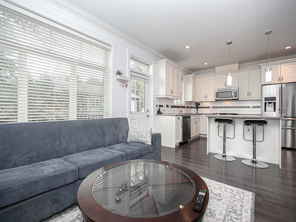 Corner townhomeHeritage-inspired architectureWide-plank laminate floorsCozy electric fireplaceGourmet kitchenShaker cabinetsQuartz countertops