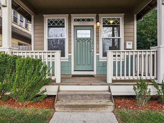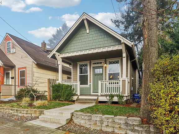 Welcome home to this adorable and surprisingly spacious move-in-ready bungalow in St. Johns! Built in 2017, the charming exterior includes a large front porch and lovely maple tree in the front yard. Opening the front door leads you into a bright, open concept living space with hardwood floors, high ceilings and a gas fireplace. The kitchen has stainless steel appliances, a gas range, quartz countertops, and an island for more prep and eating space. One bedroom and full bathroom are conveniently tucked away at the rear of the main floor. With the reverse floorplan, downstairs you will find two spacious bedrooms, a full bathroom and separate laundry room. The private, fenced backyard can be enjoyed in all weather, with a covered patio, an outdoor wood fireplace, and wiring available for a hot tub. A detached garage and extra parking pad are accessible by alley behind the home. There is a HOLTE tax exemption in place until 2027 for buyers who qualify - call the Portland Housing Bureau for more information. [Home Energy Score = 8. HES Report at https://rpt.greenbuildingregistry.com/hes/OR10186869]