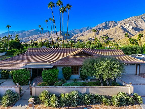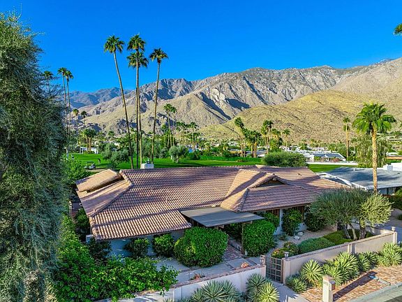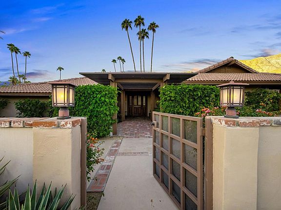 Enhancing every occasion with panoramic mountain views from its outstanding location on the fifth green of South Palm Springs' Indian Canyon North Course, this masterfully upgraded home is ready for move-in. A coveted corner lot in the prestigious Indian Canyons neighborhood extends nearly 10,018 square feet, allowing generous room for a gated front yard with patio, and a large backyard with pool and spa. Sun and shade patios provide ample space for outdoor entertaining and feature a built-in BBQ bar, brick decking and impeccably maintained landscaping. Both the front and back yards welcome stunning views of the mountains and both offer exceptional privacy. Custom built in 1965, the large single-level design measures approximately 2,864 square feet and hosts three bedrooms and three baths. The elegant residence is warm and inviting, with a large living and dining space displaying mountain views, backyard access, custom shelving and a stacked-stone fireplace. The open kitchen presents an island, peninsula, nook, granite countertops, high-end appliances and a walk-in pantry. Just off the kitchen is a bar with under-cabinet wine refrigerator, and a family room or potential fourth bedroom with a large bay window and vaulted open-beam ceiling. Baths are updated with exquisite custom tile and fixtures, and spacious bedrooms include a sophisticated primary suite with a walk-in closet, jetted tub, separate shower, two sinks, and a sitting area that opens to the backyard.