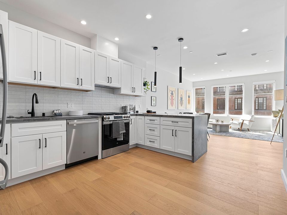 Top-floor penthouseOversized windowsFully furnished rooftop deckHigh-end finishesSleek stainless steel appliancesIn-unit washer and dryer