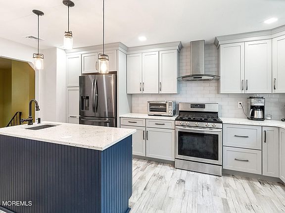 The newly remodeled chef's kitchen is the centerpiece of the home, boasting white shaker cabinetry, quartz countertops, subway‑tile backsplash, a large center island with pendant lighting and stainless‑steel appliances including a gas range, French‑door refrigerator and builtin dishwasher. Down the hall you'll find multiple generously sized bedrooms with hardwood floors and plenty of closet space. The bathrooms have been tastefully updated.