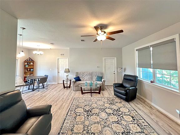 Welcome to this inviting 3-bedroom, 2-bath home offering 1,316 square feet of comfortable living space situated on a large corner lot in a peaceful community with top-notch amenities. Built in 2021, the charming front entry sets the tone for what’s inside. With wood laminate flooring in all living spaces, except for in the kitchen & bathrooms where you’ll find nicely tiled floors, this home is bound to impress guests or family visiting. Upon entering the house into the commodious living room, a ceiling fan sits above for comfort & plenty of room for couches, which sets the tone of the warm & relaxed atmosphere. The open layout flows into the dining area that has French doors leading to the scr patio & back yard & it's the perfect space for casual dining or entertaining guests. The kitchen is well-appointed with matching appliances & upgraded granite countertops highlighted by a lovely bar-counter with pendant lighting. You’ll appreciate the deep sink, the pantry closet, and a convenient lazy Susan for easy access to cookware. The split-bedroom floor plan provides privacy, with the spacious primary suite featuring a roomy walk-in closet, a ceiling fan, and a beautiful & spacious en-suite primary bathroom. The primary bathroom includes a dual sink vanity with an upgraded granite countertop, a linen closet, and a full-height tiled walk-in shower with both a handheld & rainfall shower head for a spa-like experience. Both guest bedrooms are nicely sized and also have ceilings fans. The guest bath sits between them, featuring a tub/shower combo with full-height tile surround, an upgraded granite vanity countertop & a linen closet just outside for added storage. The screened patio offers a comfortable outdoor place to unwind & relax without worrying about mosquitos. The fenced backyard provides ample space for pets to romp & play, while also creating a quiet outdoor retreat ideal for relaxing or entertaining. The home also has a two-car garage. Enjoy the many community amenities including the private community boat ramp with dock access, an eco-park, basketball courts, playground, and dog park. Golf enthusiasts will love having the newly renovated Spring Lake International Golf Resort nearby, featuring a clubhouse & local dining options. Experience the best of Central Florida living: enjoy nearby lakes, fishing, and golf course views, all while being close to shopping, restaurants, hospitals, and major highways connecting you easily to Orlando, Tampa, and Miami. And best yet, the homeowner's association fee is super low at only $50/ PER YEAR! All measurements are approximate and should be confirmed by the buyer.