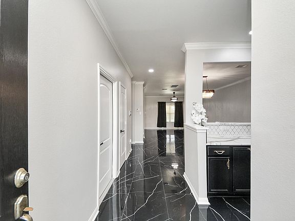 Welcome Home! This fully renovated 2-story home offers 5 beds, 2.5 baths. The 1st floor features sleek black tile flowing through the entire home! The kitchen boasts black cabinets w/ gold hardware, a white backsplash, & a gold-finish sink overlooking the living area. The primary bedroom includes a striking black-and-gold accent wall, pendant lighting, & modern ceiling fan, while the ensuite impresses w/ double gold-framed mirrors, dual sinks, custom tile wall, & a large walk-in shower w/ rainforest head & sitting area. Upstairs offers laminate flooring, a game room with black-and-gold accent wall, 4 spacious bedrooms w/ walk-in closets & ceiling fans, & a laundry room with/ shelving & coordinating accents. The renovated upstairs bath features double sinks & a tiled walk-in shower with black finishes. Outdoors, enjoy an extended covered patio with ceiling fans for entertaining. Recessed lighting throughout the home offers holiday color-changing features or bright white evening light.