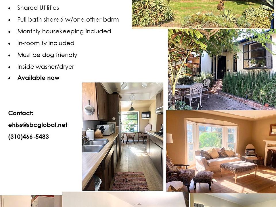Seeking a renter for home in Westchester, LMU adjacent. Furnished with new Queen bed. Mounted TV. Shared Utilities, approximately $100. per month. Dogs on property.