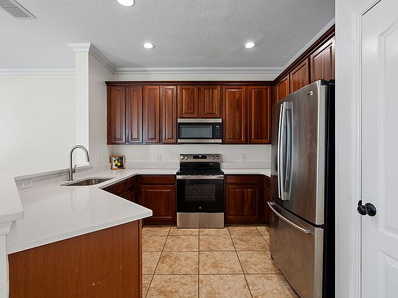 Private courtyardBreakfast barAbundant natural lightOpen-concept layoutCrown moldingRecessed lightingStainless steel appliances