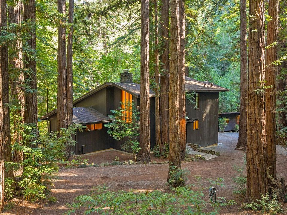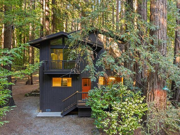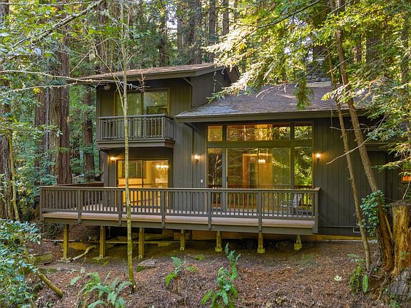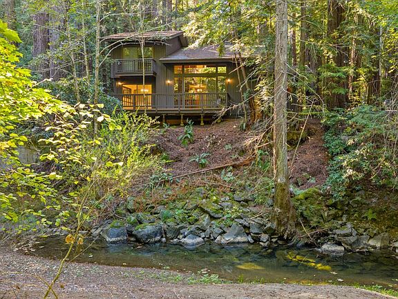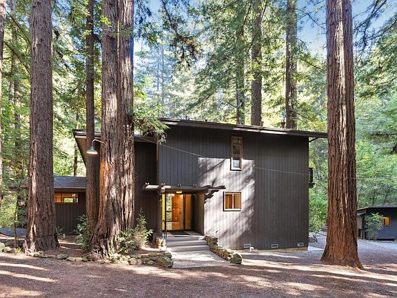 Surrounded by towering redwoods, this architecturally distinct home captures the essence of tranquility and design in a natural setting. Resting on approximately 19.8 acres with a year-round creek, this private retreat combines timeless mid-century style with the serenity of Marin's redwood forest. The two-story residence offers 2,047 sq ft of living space and an additional 1,297 sq ft of versatile structures including a detached workshop, cabin, and shed. Vaulted open-beam ceilings, warm wood paneling, and expansive windows create a stunning focal point in the main living area where natural light floods the space and glass doors open to an inviting wraparound deck. The kitchen offers custom wood cabinetry, tiled counters, and direct deck access for seamless indoor-outdoor living. Upstairs, the primary suite features a private balcony overlooking the forest, while additional bedrooms and an office provide flexible living or workspace options. The property includes a private bridge over the creek, a workshop with skylights, and multiple trails that weave through the redwoods. Offering both peace and inspiration, this nearly 20-acre sanctuary feels worlds away yet remains just minutes from Nicasio, West Marin, and Lucas Valley conveniences.