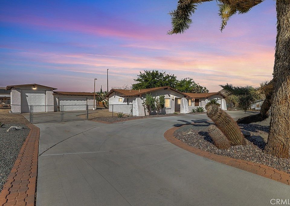 Welcome to 6938 La Habra Avenue in Yucca Valley, a beautifully updated three-bedroom, two-bathroom home offering both comfort and versatility. This property features fresh exterior paint with a lifetime transferable warranty, and is powered as an all-electric home with a solar lease at only $130 per month. The roof is in good condition and approximately five years old, while the newly landscaped front yard showcases clean desert rock for easy maintenance. A large circular driveway provides convenience, along with RV and trailer parking. In addition to the attached two-car garage, there is an impressive detached three-car garage/shop of approximately 1,200 square feet (40x30) that includes an office and bathroom, and is tall enough to accommodate a small RV. Inside, the home has new interior paint throughout, radiant ceiling heat, and a wood-burning stove for cozy desert nights. The primary bedroom features a walk-in closet, carpet that has been professionally steam-cleaned, and a private bath with a stand-up shower. The additional bedrooms offer ceiling fans, tile flooring, and ample space. The kitchen, while in original condition, is exceptionally well-kept and functional. Other property features include dual storm windows, a covered front porch, a rear covered patio, a shed, mature shade trees including fruitless mulberry trees, and enormous epic Joshua Trees. There are laundry hookups for either propane or electric dryers. This home is well-located near shopping, dining, and public transportation, and sits just minutes from Joshua Tree National Park, offering endless hiking, climbing, and outdoor recreation. Yucca Valley also provides proximity to community parks, golf, local schools, and cultural attractions like the Hi-Desert Nature Museum and Joshua Tree’s renowned art and music scene.