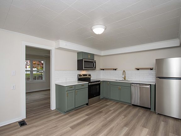 Rear patioEat-in kitchenStorage buildingNew appliancesMetal roofCovered front porchCorner lot