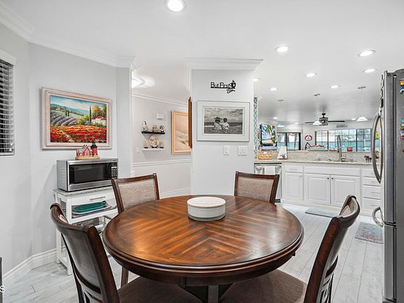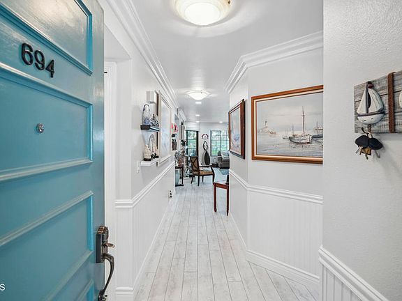 Welcome to your beautiful condo on the beach. Completely turnkey and in immaculate condition, this Surfside IV condo has peak-a-boo ocean views and is steps to the beach, pier and restaurant. With no stairs, this home features the largest 2 bedroom condo floorplan in Surfside IV with 1,299 square feet of living space. The eat-in kitchen has been beautifully remodeled with granite countertops, custom glass backsplash, crown molding, stainless steel appliances with breakfast bar. High end wood-like vinyl flooring (COREtec) in the living areas with porcelain tile floors in the bathrooms. The spacious living room with gas fireplace, crown molding and direct access to the patio. The Master suite has a large walk-in closet, access to the private patio, ceiling fan and double vanity ensuite with quartz countertops and oversized frameless shower enclosure. Recessed and LED lighting and newer dual pane windows and sliders throughout. Down the hall, you have the washer/dryer area with tastefully updated guest bathroom with granite countertops and guest bedroom with ceiling fan. As a plus, the detached garage has pull-down stairs to access the overhead loft. Surfside IV gated community feels like you are living in a resort and has its own private clubhouse with great amenities including indoor heated pool and spa, sauna, gym & cardio rooms, library area, game floor with pool, ping pong and foosball tables, fully equipped kitchen and banquet facilities for hosting events. Your perfect beach retreat is waiting for you.