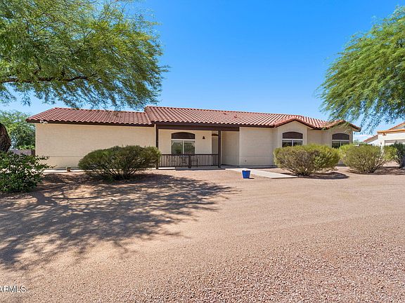 This home is the complete package-4 bedrooms, 2 bathrooms, 8+ car garage, a pool, horse property on an acre, with amazing views of the Superstition Mountains...WOW!!! Pride of ownership shows throughout this property. It has been well taken care of. Lots of parking for all the toys between the attached 2+ car garage & the detached 6 car garage out back. RV pad with 30 amp service. This fully fenced, flat usable lot still has space out back for more parking. Plenty of room to add a barn & corral if you want. The pool is so inviting & is perfect for cooling off in. While you rest & watch the gorgeous sunsets on the long covered patio you can listen to the relaxing sound of the pool waterfall. The front porch is perfect for enjoying the majestic Mountain Views.