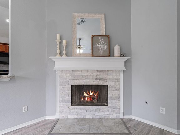 Cozy stone-surround fireplaceWood-look floorsCharming single-story brick homeGranite countertopsOpen kitchenSpacious walk-in closetTimeless curb appeal