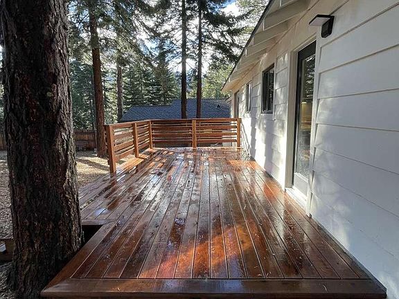 Escape to the quiet, coveted corners of Gardner Mountain with this completely reimagined home. An alpine sanctuary where Hygge meets Tahoe Blue. A study in serene, Scandinavian-inspired living just moments from Tahoe's pristine forests and celebrated beaches. Stepping inside, you'll feel the vibe of a redesign rooted in simplicity and light. This 2 bedroom, 1 bathroom home has been completely and thoughtfully remodeled, creating a haven where every detail contributes to a feeling of hygge. The heart of the open concept home is an updated kitchen, including crisp quartz countertops, refreshed cabinetry and stainless appliances. The grand bar, wrapped in exotic Sapele wood, invites morning coffee, dining and entertaining. The adjacent, sparkling new bathroom offers a unique textural surprise underfoot with a custom Japanese pebble floor in Tahoe Blue colors, a deep soaking tub with timeless shower tile. Sunlight streams through the new dual pane windows, illuminating the blend of mid-century modern touches that warm the Scandinavian palettethink clean wood tones, geometric finesse, and purposeful fixtures. For cozy Tahoe nights, the living area features a modern fireplace with gas insert, offering instant warmth and ambiance without the fuss. The newly paved driveway leads to an oversized garage featuring a custom, full 8' tall by 10' wide Martin garage door, providing generous, easy access for full size vehicles and exceptional storage. Beyond the home, two brand new redwood decks offer both a perfect backyard sun-drenched spot, plus a friendly front covered porch facing a Conservancy lot. The huge, fully fenced backyard provides a private realm for pets or quiet enjoyment, with plenty of space for an ADU. This is more than a remodel; it's a foundation for a simplified life.