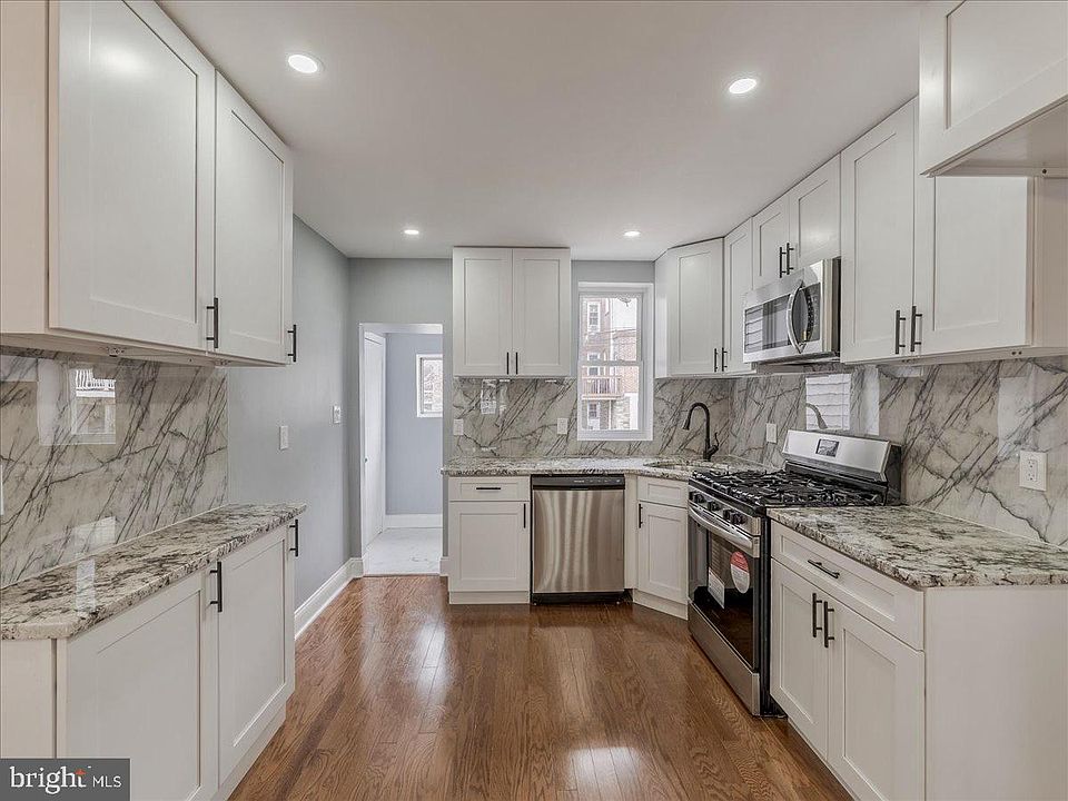 Welcome to this beautifully renovated 4-bedroom, 2-full bath home in the heart of West Oak Lane. As you approach, you'll be greeted by a charming covered porch, perfect for relaxing or socializing. Inside, an inviting open floor plan features elegant tray ceilings, gleaming hardwood floors, and recessed lighting throughout. The custom kitchen boasts brand-new stainless steel appliances, sleek granite countertops, and white shaker soft-close cabinetry—ideal for both cooking and entertaining. Just off the kitchen, a charming deck awaits, perfect for grilling or enjoying your morning coffee. Upstairs, you'll find a bright and spacious primary bedroom, complemented by two additional well-sized bedrooms and a beautifully updated full hall bath. The fully finished lower level adds even more living space, with a laundry area, a fourth bedroom, a separate living room, and a large full bath. The lower level also offers convenient access to the rear of the home, where you’ll find a designated parking spot, plus there is plenty of on-street parking available out front. This move-in-ready gem is ideally located, with easy access to shopping, schools, public transportation, and Simons Recreation Center. <br><br> NEW HVAC (2025), NEW WATER HEATER (2025), NEW WINDOWS (2025), NEW ROOF (2025), NEW SIDING BACK OF HOME (2025), HARDWOOD FLOORS (2025), LVP (2025), NEW STAINLESS STEEL APPLIANCES (2025), UPDATED PLUMBING (2025), UPDATED ELECTRIC (2025), RECESSED LIGHTING, TRAY CEILINGS, FRONT PORCH, SIDE DECK
