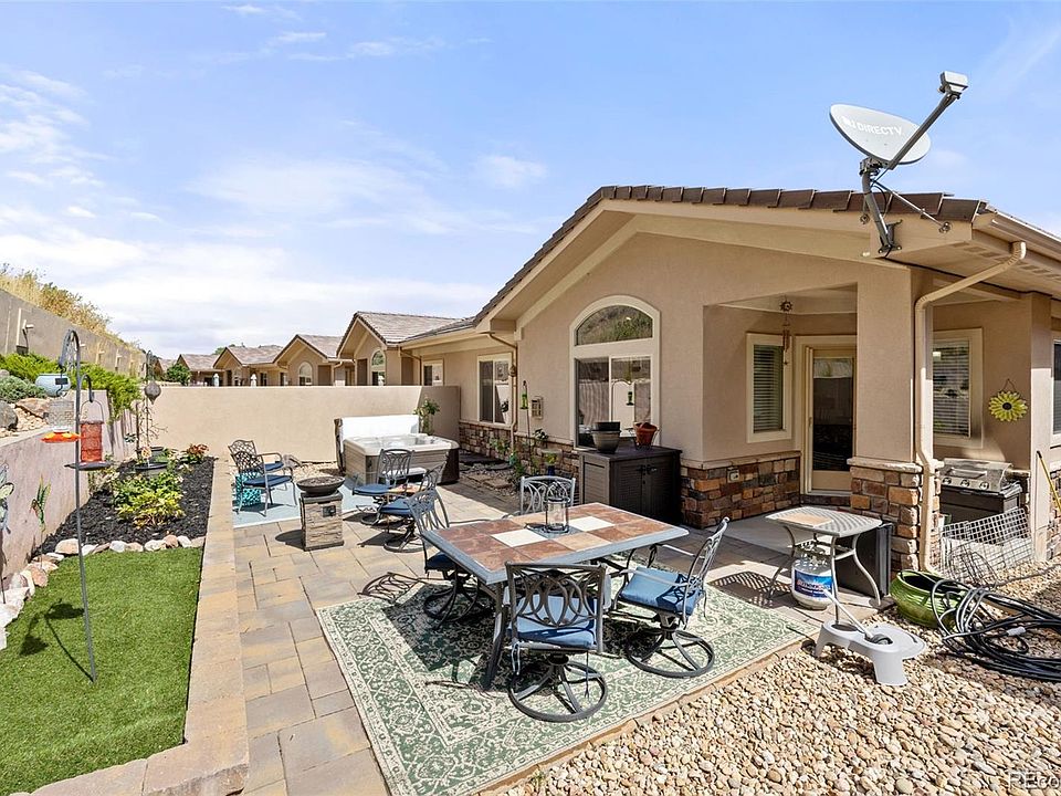 Perfect xeriscaped backyard for the outdoor enthusiasts featuring a walled-in patio with hot tub, garden beds and stunning open space with views of the red rocks. This home is perfect for entertaining or relaxing under the stars.